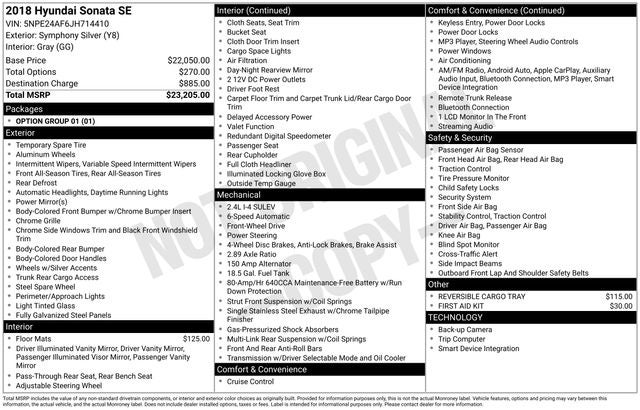 2018 Hyundai Sonata SE Symphony Silver One Owner, Gray Cloth, Apple CarPlay & Android Auto, Exterior Parking Camera Rear, Remote keyless entry, Steering wheel mounted audio controls, YES Essentials Premium Cloth Seating Surfaces. Certified. 25/36 City/Highway MPG CARFAX One-Owner.